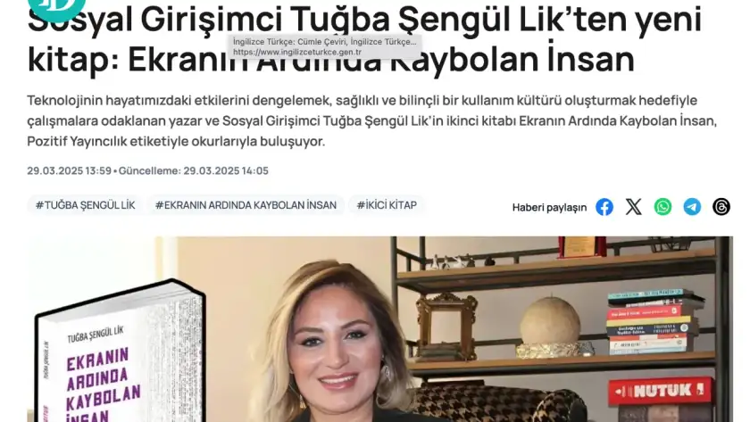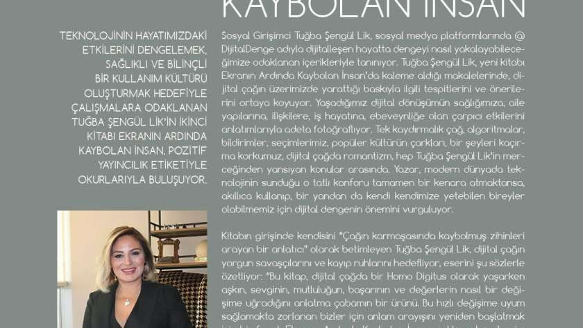 Ekranın Ardında Kaybolan İnsan, Bir Dijitalzedenin Dengeyi Bulma Rehberi-Biz de Aslen Buralı Değiliz kitaplarının yazarı Tuğba Şengül Lik, teknolojinin hayatımızdaki etkilerini dengelemenin, sağlıklı ve bilinçli bir kullanım kültürü oluşturmanın önemini vurguluyor Dijital dünya alanındaki çalışmalarını genişletmek için Dijital Denge Derneğini kuran sosyal bir girişimci Tuğba Şengül Lik… Merakı, yerini farkındalığa, farkındalığı ise zamanla sorumluluğa bırakmış.…
